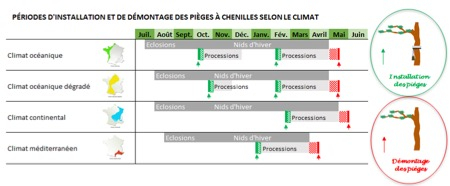 L’installation des pièges doit se faire avant le départ en procession de nymphose. Les spécificités des dates de pose et de désinstallation des pièges selon le type de climat sont précisées ci-dessous