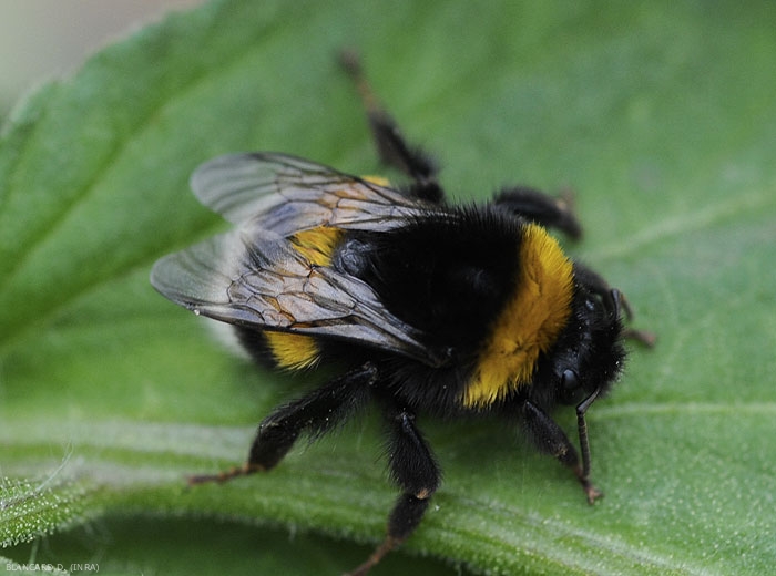 Les bourdons les plus représentatifs (genre Bombus) sont très velus (tête, thorax, abdomen et pattes). Leurs pattes ne sont pas jaunes comme celles du frelon asiatique (figures 3 à 5) et leur taille est variable selon les espèces, mais globalement plus petite que celle du frelon asiatique. Elle peut varier de 10 à 25 mm, ceci en fonctionde l’espèce ou s’il s’agit d’une reine ou d’une ouvrière.