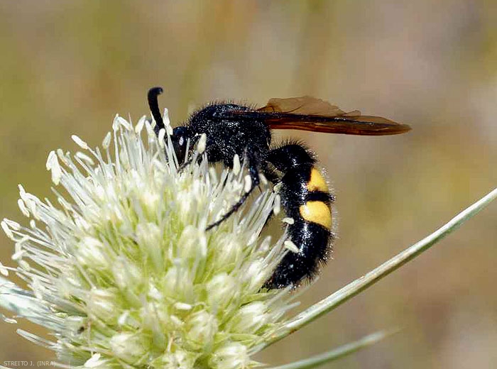 La scolie des jardins est le plus grand hyménoptère de France. A ce titre, elle peut être confondue avec le frelon asiatique. C’est une espèce totalement pacifique, même si elle dispose d’un dard. Notons qu'elle participe à la pollinisation des fleurs.