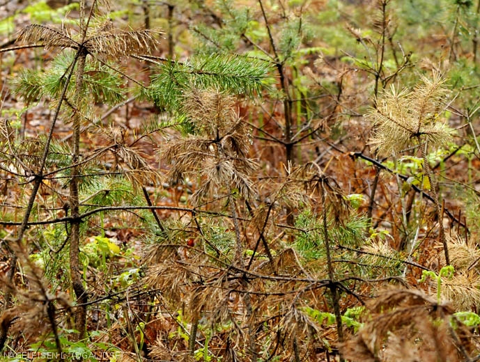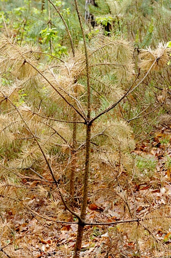 - défoliation des arbres adultes au cours du mois de mai par de gros coléoptères