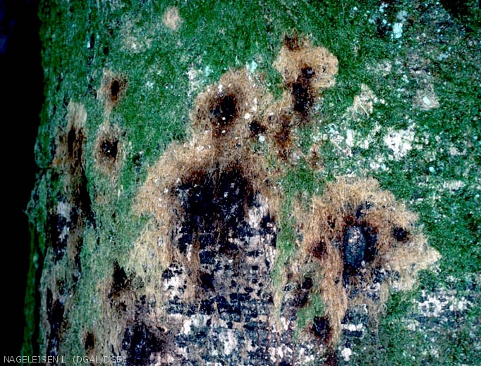 - Flétrissement et mort de l'arbre si le champignon s'installe massivement suite à de fortes attaques de cochenille ou sur des arbres préalablement affaiblis par la sécheresse ou des problèmes de nutrition minérale, ou sur des arbres âgés