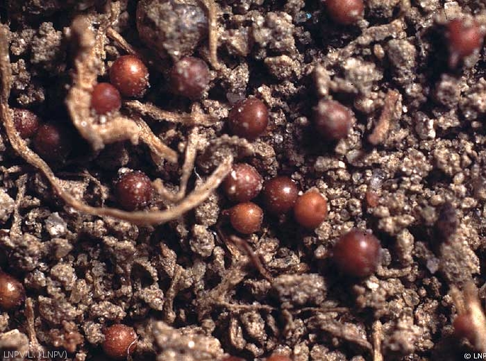 L’observation de plantes arrachées dans ces foyers pendant la tubérisation (figure 2) montre sur le système radiculaire la présence des femelles blanches ou jaunes (figures 3 et 4) et de kystes bruns (figure 5).