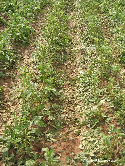 L’importance des dégâts dépend de l’intensité de l’averse de grêle subie. A l’extrême, la surface foliaire est presque totalement détruite (figures 1 et 2) avec de nombreux impacts sur les tiges qui se retrouvent « lacérées » (figures 3 et 4). Dans certains cas, on note l’impact direct des grêlons sur les tubercules (flancs ou dessus de buttes). Une protection anti-mildiou adaptée est nécessaire.