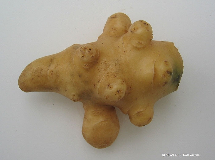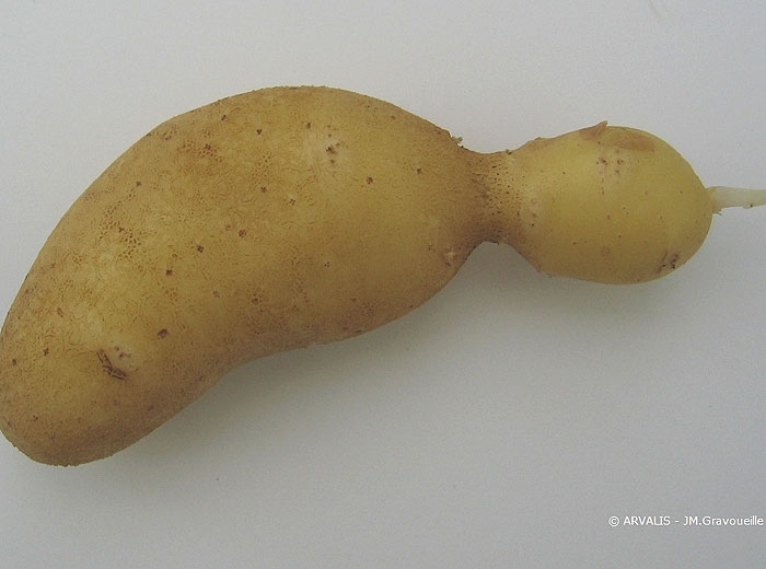 Les formes prises par les tubercules dépendent de la période à laquelle a lieu l’à-coup de végétation. S’il survient en début de tubérisation, l’arrêt de croissance donne une constriction au niveau du talon (tubercule piriforme, figure 2) ; s’il se produit en milieu de tubérisation, les deux parties formées peuvent être sensiblement de même grosseur (diabolo, figure 3) ; s’il intervient en fin de tubérisation, une excroissance se développe à l’extrémité de la couronne (surgeon). Parfois la croissance se fait au niveau de plusieurs yeux latéraux donnant des protubérances de formes et de tailles variables (figure 4).