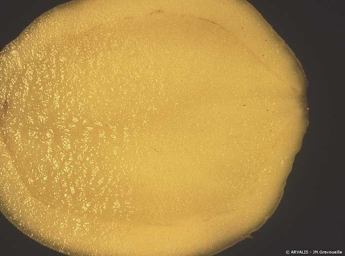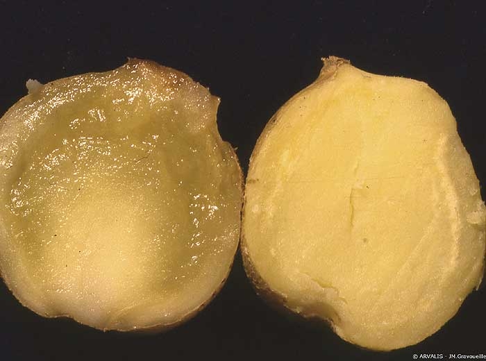 La vitrosité (figures 5 et 6), conséquence des déformations ou de la tubérisation en chapelet,se traduit par l’apparition de zones translucides plus ou moins étendues à l’intérieur de la chair des tubercules, qui ont pour origine la disparition partielle ou totale des grains d’amidon dans les tissus concernés (figure 7). Ces tubercules sont impropres à toutes utilisations et présentent, pour les plus atteints, un risque de liquéfaction totale ou partielle pendant la conservation. Dans le cas des plants, les tubercules fortement atteints germent mal et donnent des plantes chétives.