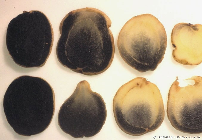 - En situation à risque, éviter les variétés sensibles (Bintje, BF 15, Roseval, Russet Burbank…). Les variétés plutôt précoces et à tubercules arrondis ou oblongs courts sont généralement moins sensibles que celles à tubercules allongés,