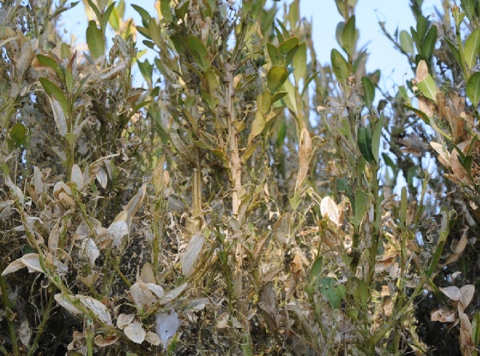 Au stade larvaire (les chenilles, figure 1), la pyrale du buis occasionne des dégâts importants sur les buis (figure 2). Cet insecte qui développe entre 2 et 4 générations chaque année, provoque à chaque génération de très forts dégâts. Sans gestion, les arbustes, les haies ou les arbres en pot attaqués par la pyrale du buis, finissent par mourir par effet cumulatif (figures 3 et 4). En forêt, certaines buxaies patrimoniales ont été totalement défoliées, d'autres n'ont pas encore subit de dégâts.