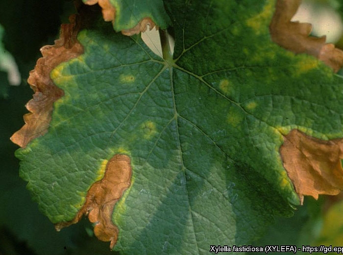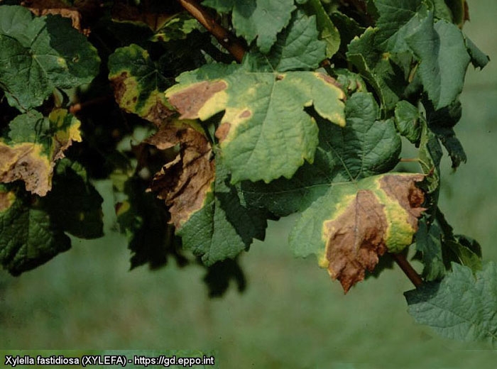 Les premiers symptômes de la maladie de Pierce sont foliaires et apparaissent surtout durant les périodes estivales chaudes et sèches, ou lorsque les ceps de vigne subissent des stress hydriques. Ainsi, des roussissements et des dessèchements partiels des feuilles se manifestent. Les lésions du limbe en vert sont sectorielles et/ou périphériques, de couleur brunâtre, jaunes à rougeâtres en bordure. Le dessèchement du limbe s'étend progressivement, et par la suite des feuilles entières se nécrosent et chutent, seuls les pétioles restant attachés.