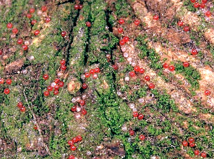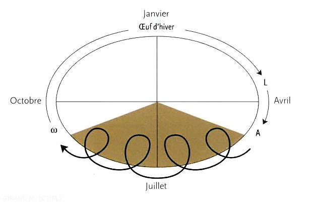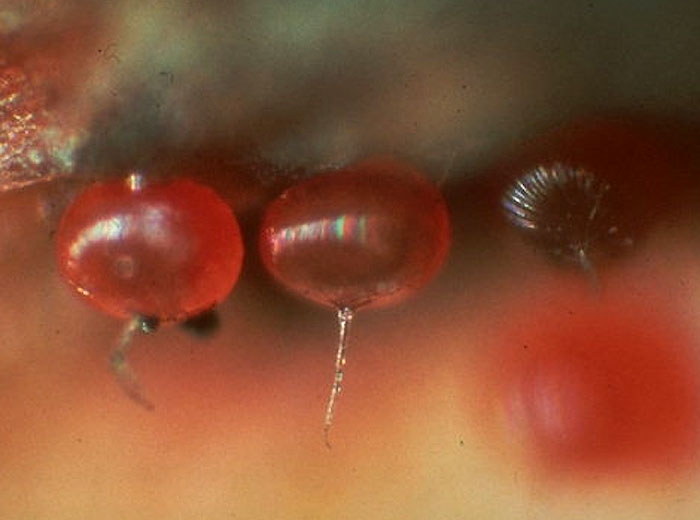 Les œufs sont déposés sur le bois (figures 2 et 3), à l’aisselle des rameaux ou des bourgeons à partir de fin juillet à la mi-août. L’acarien rouge hiverne sur le bois à l’état d’œufs très résistants au froid (-30 °C). La période d’éclosion de la majorité des pontes se situe de mi-mars à courant avril.