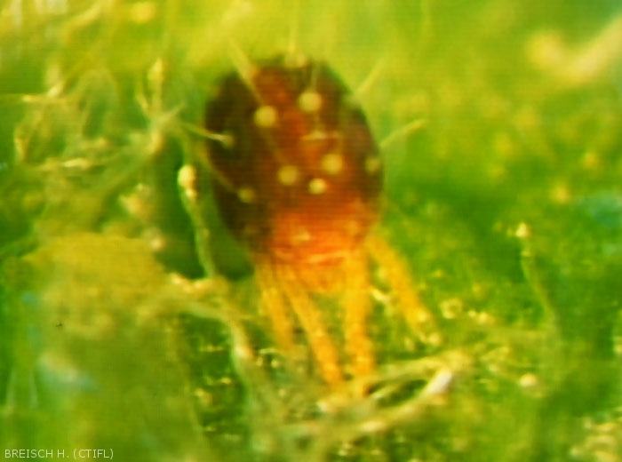 Les femelles adultes de l’acarien rouge (figure 1) sont globuleuses et à peine visibles à l’œil nu (0.4 mm). Elles sont d’un rouge vif, parfois sombre, avec deux séries de tubercules dorsaux blancs portant des soies blanches. Les mâles rouge orangé sont plus petits (0.3 à 0.35 mm). Ils sont allongés avec l’extrémité du corps conique.