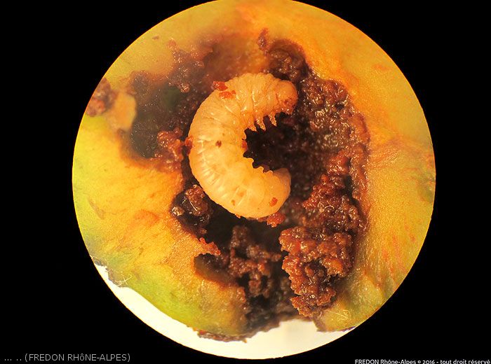 En fin de développement larvaire (fin mai à mi-juin), le fruit tombe et la larve s’enfonce dans le sol pour y tisser son cocon ovoïde agglutinant de petites particules de terre. La larve diapause dans le sol à environ 5-8 cm de profondeur.