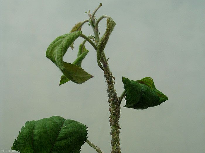 Les colonies importantes (figures 1, 2 et 3) provoquent l’enroulement et la déformation des feuilles (figures 4 à 10) et des rameaux (pseudo-galles).