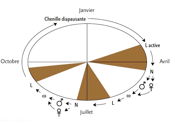 Il y a deux générations par an et trois périodes d’activité larvaire, avec des dégâts différents. L’hibernation a lieu au stade larvaire L2-L3 dans un cocon soyeux.