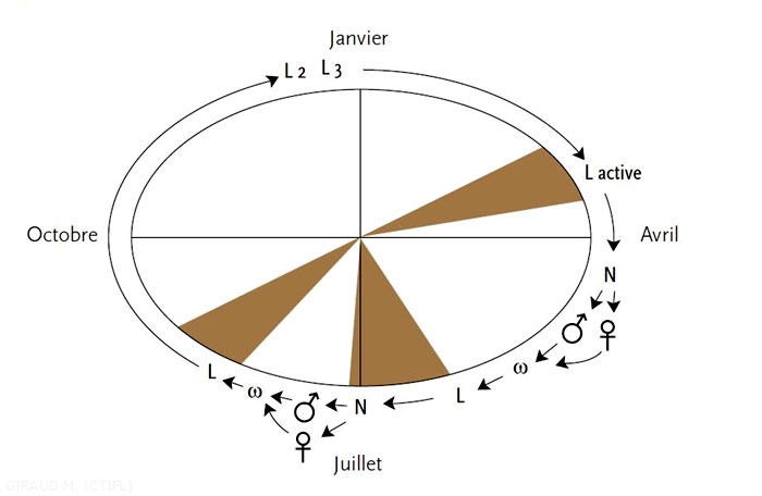Les pontes sont déposées le soir, dès que les températures sont supérieures à 13°C,et s’intensifient à partir de 15°C, avec un optimum à 18°C.