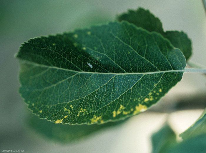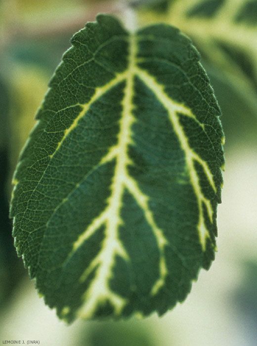 Les taches, généralement jaune franc à crème, évoluent pendant la croissance annuelle : mosaïque dispersée sur les premières feuilles, puis réticulation sur les nervures, parfois jaunisse partielle ou totale, enfin stries ou points diffus sur quelques feuilles estivales, et rétablissement lorsque la température s’élève.