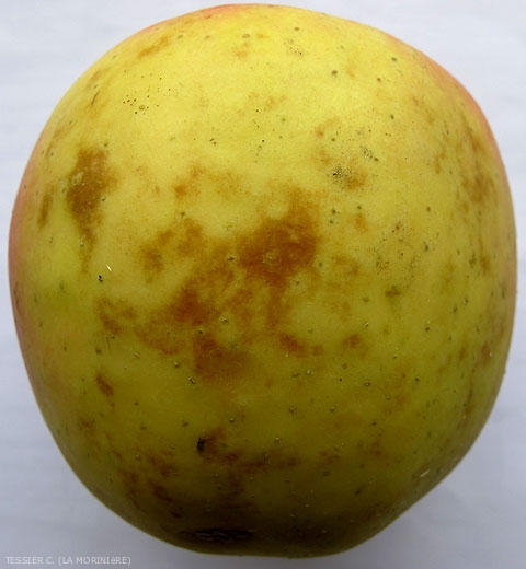 Brunissement superficiel, en plages diffuses (figure 1 à 5), plus facilement observable sur les parties peu colorées du fruit et pouvant devenir d’aspect rugueux. La chair sous l’épiderme n’est pas affectée (figure 6). L'apparition des symptômes a lieu en général à partir de décembre en froid normal, février en atmosphère contrôlée; les symptômes s’accentuent après sortie d’entreposage (figures 7 à 9) à température ambiante.