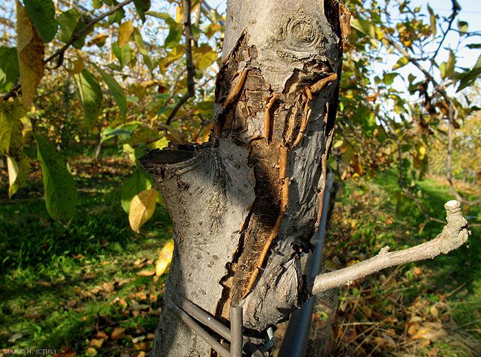 - Lésions nécrotiques sur le tronc, les branches ou les rameaux, souvent autour de blessures (taille, gel, grêle)