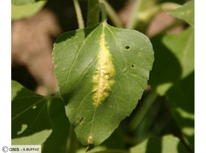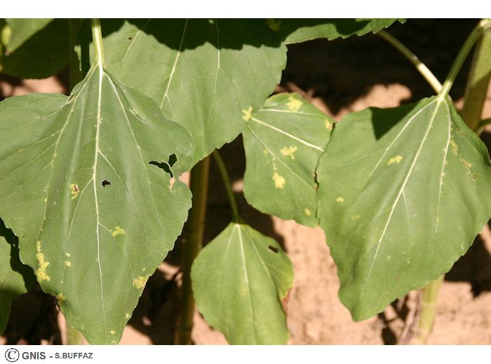 Des symptômes peuvent aussi se déclarer sur pétioles, tige et bractées du capitule, sous forme de taches superficielles vert glauque et d’un aspect huileux.
