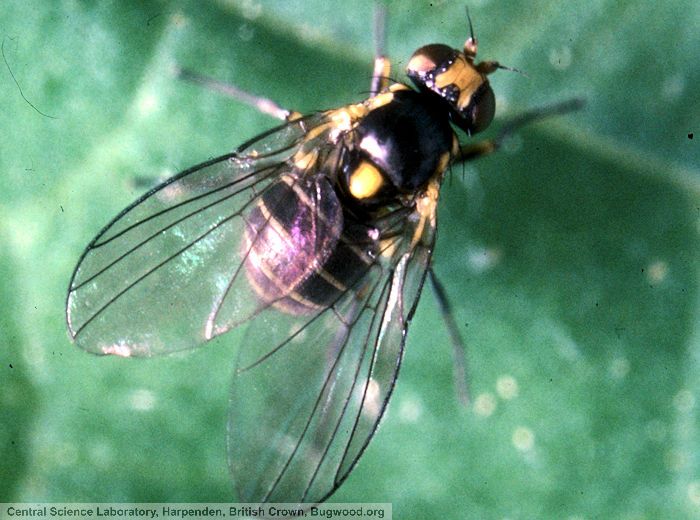 - adulte : petite mouche de 1,5-2,5 mm de longueur, couleur jaune et noire