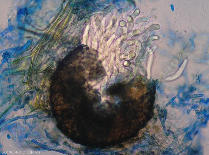 - Sporulation : forme assez rapidement des périthèces (figures 6 et 7) et des pycnides (figures 8 à 12) à la surface des tissus lésés. Ces structures globuleuses brunes à noires à maturité (figures 2 à 5) produisent respectivement des ascospores et des conidies en grandes quantités.