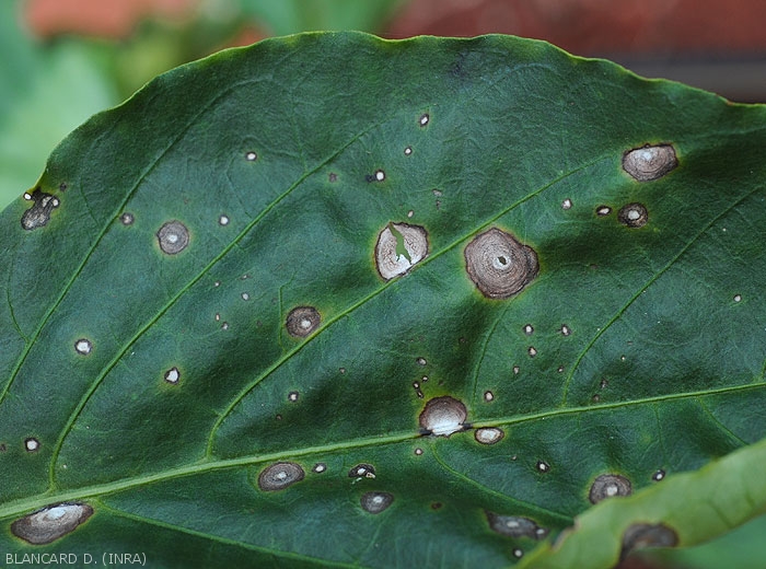 Par la suite, les taches s'étendent, brunissent, et se nécrosent progressivement (figure 2). Un liseré brun rougeâtre les ceinture. leur diamètre peut être supérieur à 1 cm.