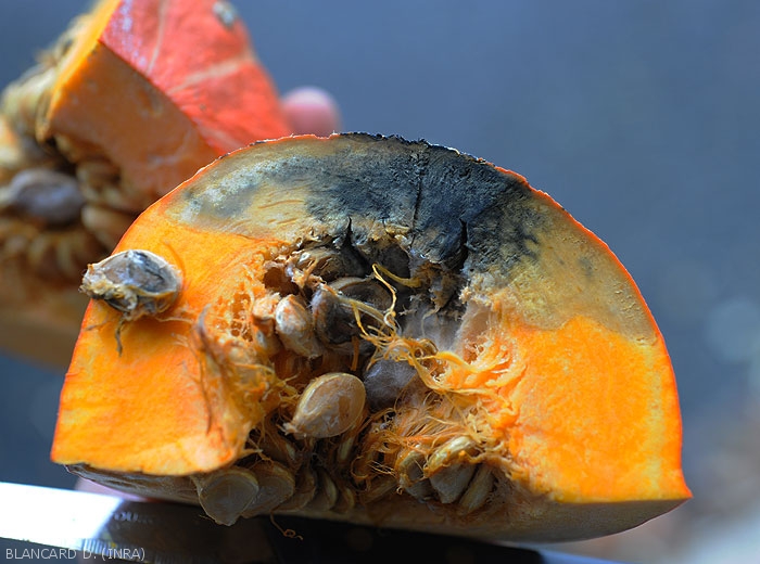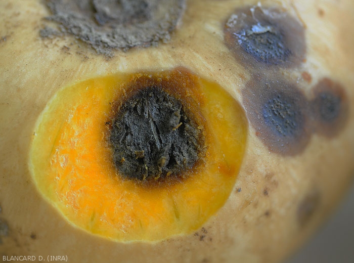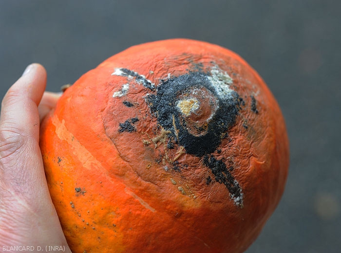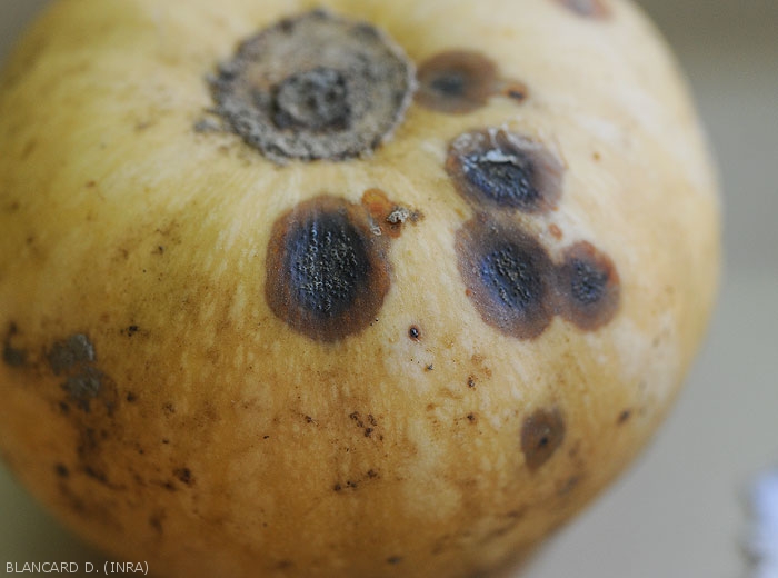 • Lésions d'abord limitées, humides et sombres  s'initiant sur fruits au hasard (figures 5 à 10, à partir de pièces florales plus ou moins sénescentes, au niveau de la zone stylaire, de micro blessures (zone pédonculaire). De larges lésions peuvent s'initier au contact du sol (figures 11 à 14). De forme irrégulière, elles s'étendent et noircissent progressivement, la chair prend une teinte noirâtre.