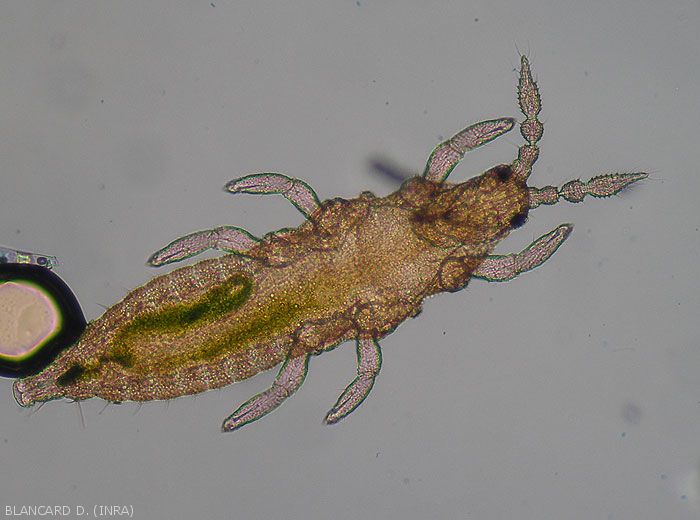 - Le premier stade pronymphe est caractérisé par l'apparition des ébauches d'ailes. Le deuxième stade pronymphe, plus clair, montre aussi des ébauches d'ailes plus conséquentes et des antennes longues et courbées vers l'arrière du corps.