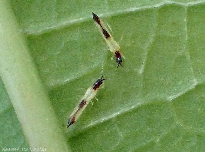 - Œufs réniformes déposés sur les organes aériens, surtout les feuilles.
