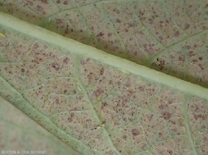 - Nombreuses et minuscules lésions argentées, voire des plages de taille et de forme irrégulières apparaissent sur le limbe (figure ) ; elles se nécrosent progressivement et prennent une teinte beigeâtre.