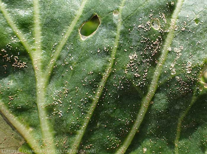 En zones tropicales humides, Rhizoctonia solani n'a pas comportement tellurique qu'on lui connait en métropole sur légumes (remplacer par Sclerotium rolfsii), son parasitisme est plus aérien s'attaquant plus volontier à leurs folioles et leurs feuilles (figures 1 et 2). Des souches particulières sont souvent impliquées, reconnaissables par le mycélium et les nombreux sclérotes arrondis quelles produisent sur les lésions , parfois avant même que le champignon ait pénétré dans les tissus (figures 3 à 5).