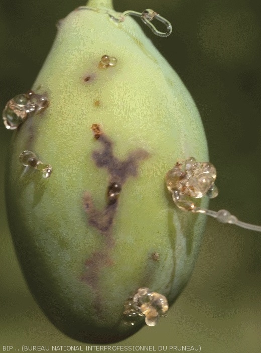 Les fruits attaqués présentent des galeries superficielles. Des écoulements gommeux caractéristiques peuvent alors être observés. Ils correspondent à une défense naturelle des fruits. Avec un peu d'attention, et à l'aide d'une loupe, il est possible d'observer une trace d'oeuf à proximité de la perforation.