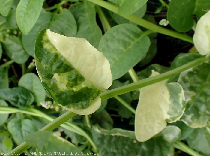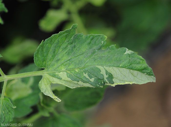- décolorations foliaires affectant une à plusieurs feuilles : des secteurs contigus jaunes à blancs, plus ou moins bien étendus, sont visibles sur le limbe (figure 1) ;