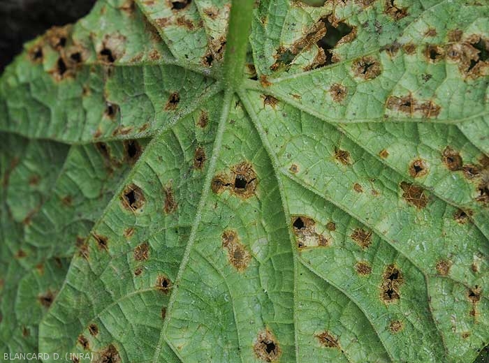 • Présence d'un halo translucide à jaunâtre autour des lésions, les tissus interne pouvant se décomposer et tomber conférant au limbe un aspect criblé. Parfois défoliation importante.