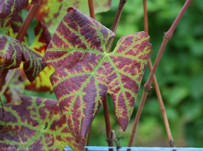 L'Enroulement de la vigne, comme son nom l'indique, entraine un enroulement du bord des feuilles vers la face inférieure du limbe (figures 8 à 14).