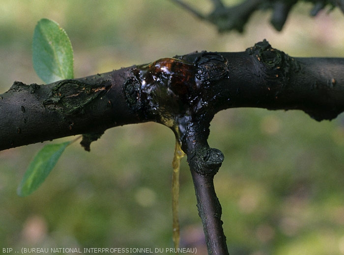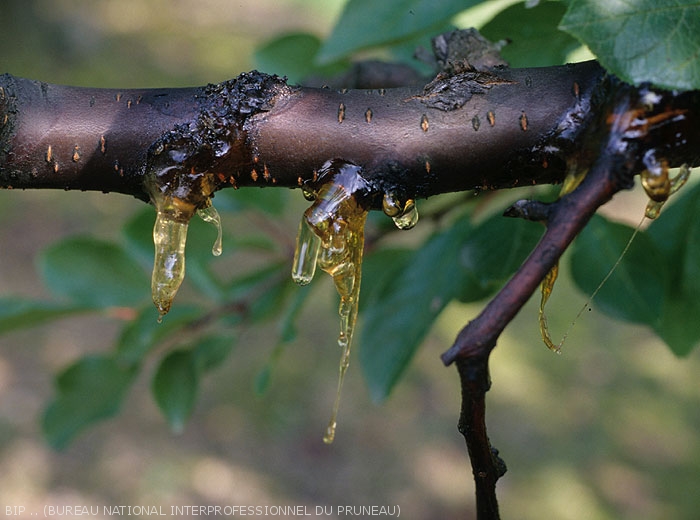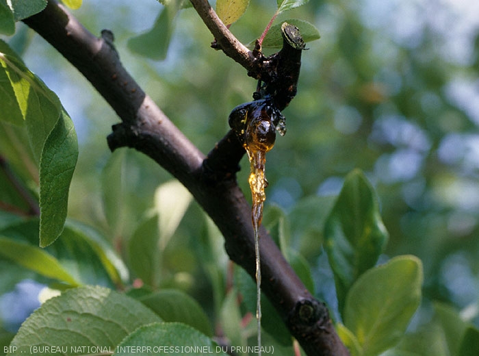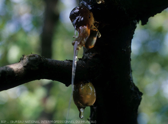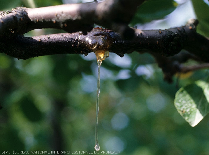 En présence de gomme, il convient donc de rechercher les autres indices / symptômes qui permettront de poser un diagnostic (Voir fiche Bactériose à Pseudomonas sp. et fiche Monilioses Monilia spp.)