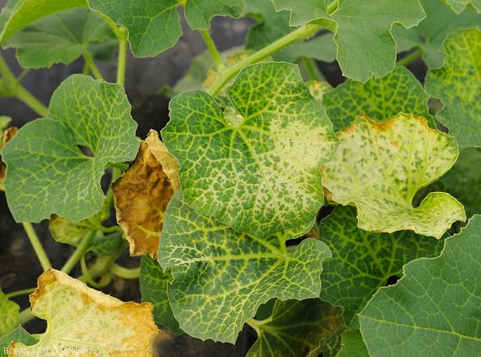 - marbrure, jaunissements foliaires (en taches, nervaires, en périphérie du limbe, internervaires ; blanchiment ; teinte verdâtre à livide, aspect terne et/ou bronzé du limbe) (figures 4 à 8) ; lésions, taches chlorotiques plus ou moins étendues, devenant rapidement nécrotiques (figure 9) ; flétrissements et desséchements (figures 10 et 11) ;