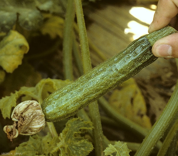 - Mosaïque plus ou moins marquée, piqûres sur fruits (figures 2-melon ; et 5-courgette).