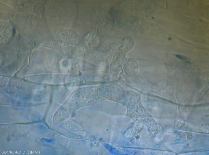 - Signes : diverses structures en fonction du champignon ou de l'oomycète responsable (mycélium - figures 7 et 8-, sclerotes, oospores - figure 9 -, sporanges, etc.).
