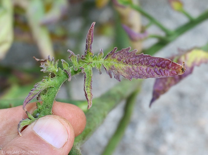 Feuilles déformées et décolorées : plus ou moins jaunes (yellows) et/ou violacées (anthocyanées) (figures 3 et 4). Limbe des feuilles souvent plus épais, voire cassants.