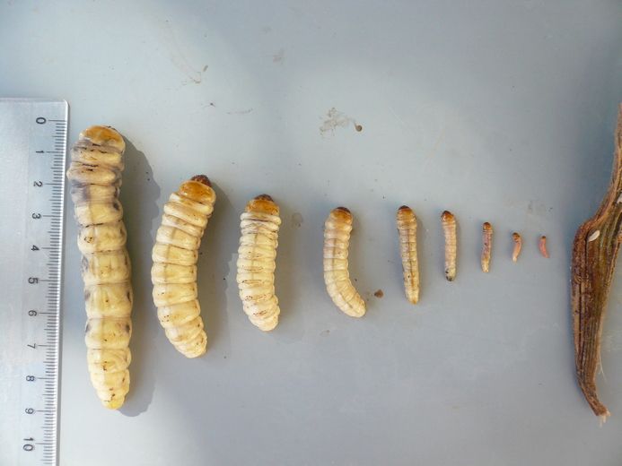 Stade chenille : blanchâtre, 55 à 70 mm de long, trois paires de pattes thoraciques de taille réduite et des épines dorsales disposées en ovale. La capsule céphalique est brunâtre et dotée de puissantes mandibules. Dès l’éclosion, les jeunes chenilles foreuses (d’environ 4 à 5 mm de long) pénètrent dans le stipe*, où elles vont passer l’hiver. Elles emmagasinent alors d’importantes réserves qui permettront d’assurer la vie des adultes. Une chenille au dernier stade peut mesurer jusqu’à 9 cm de long et 1.5 cm de large. On peut noter que les chenilles de papillon du palmier sont cannibales à tous les stades de leur évolution. Les larves créent de la sciure tout au long de leur vie dans le palmier, le grain étant proportionnel à l’âge de la chenille. A la fin de son évolution, la chenille se dirige vers le bord externe du stipe et forme un cocon à base de soie et de sciure. Elle réalise sa métamorphose en environ 66 jours, les cocons « vivants » peuvent être trouvés de mi-mars à mi-septembre (Sarto, 2013).