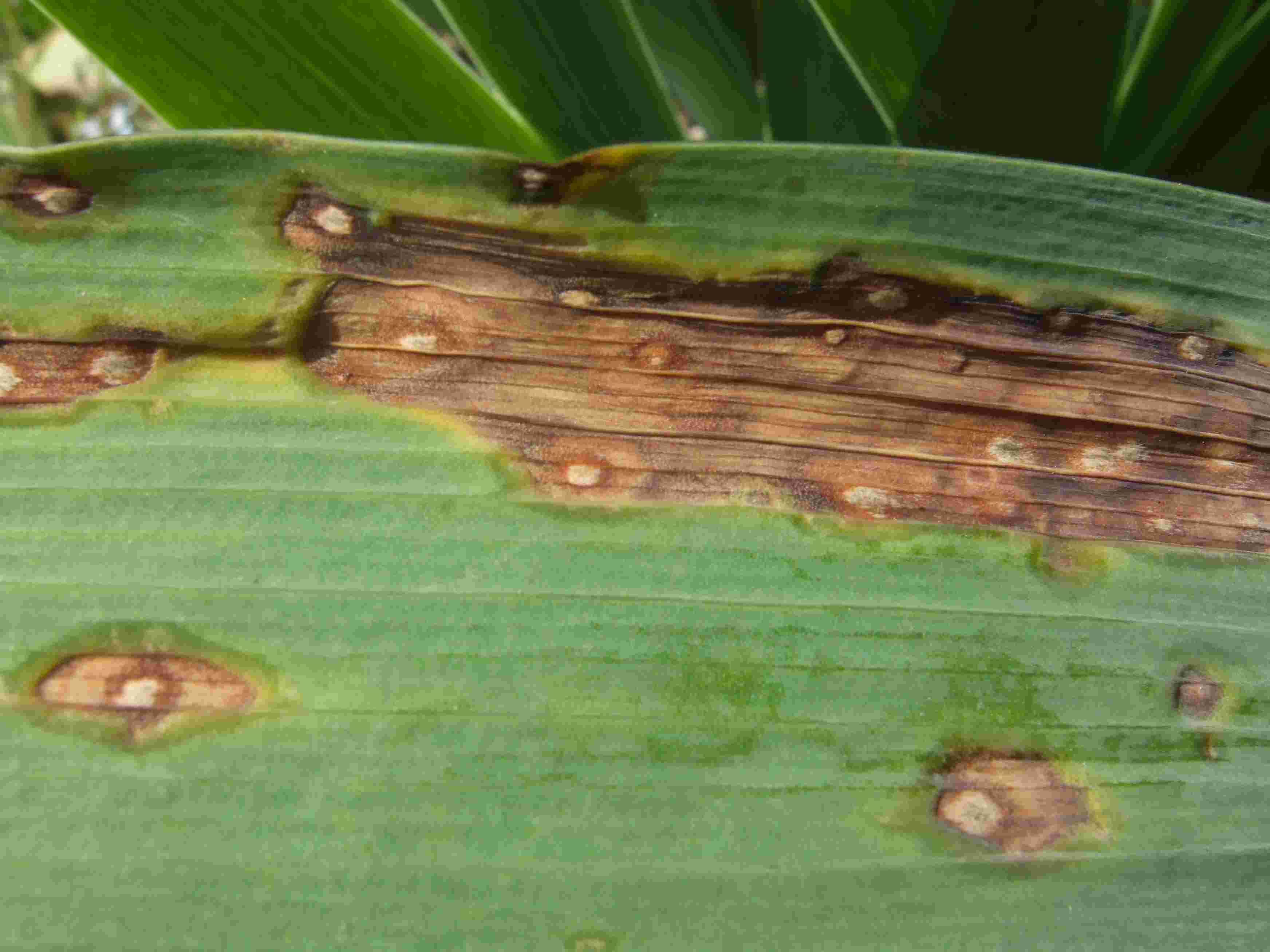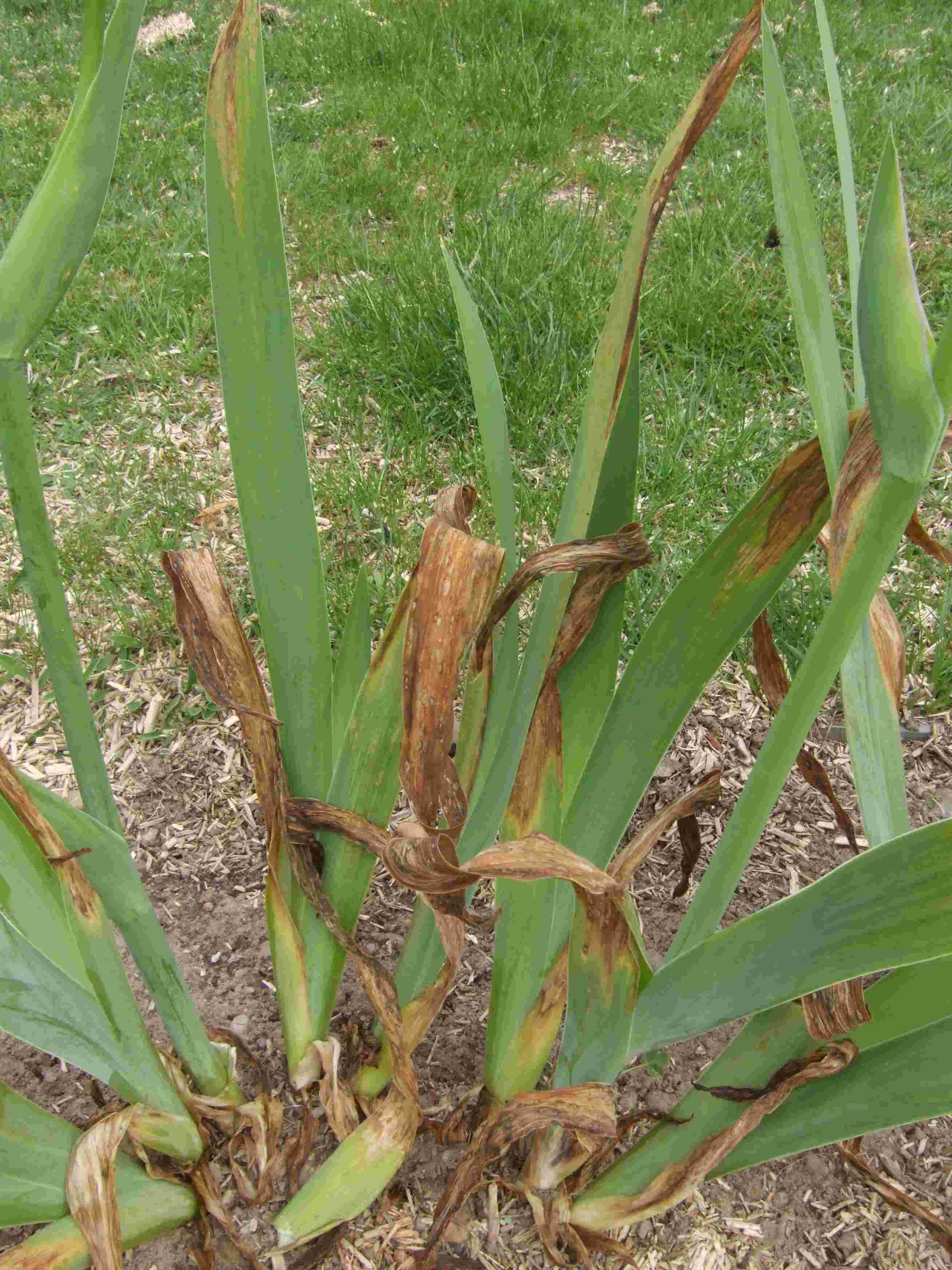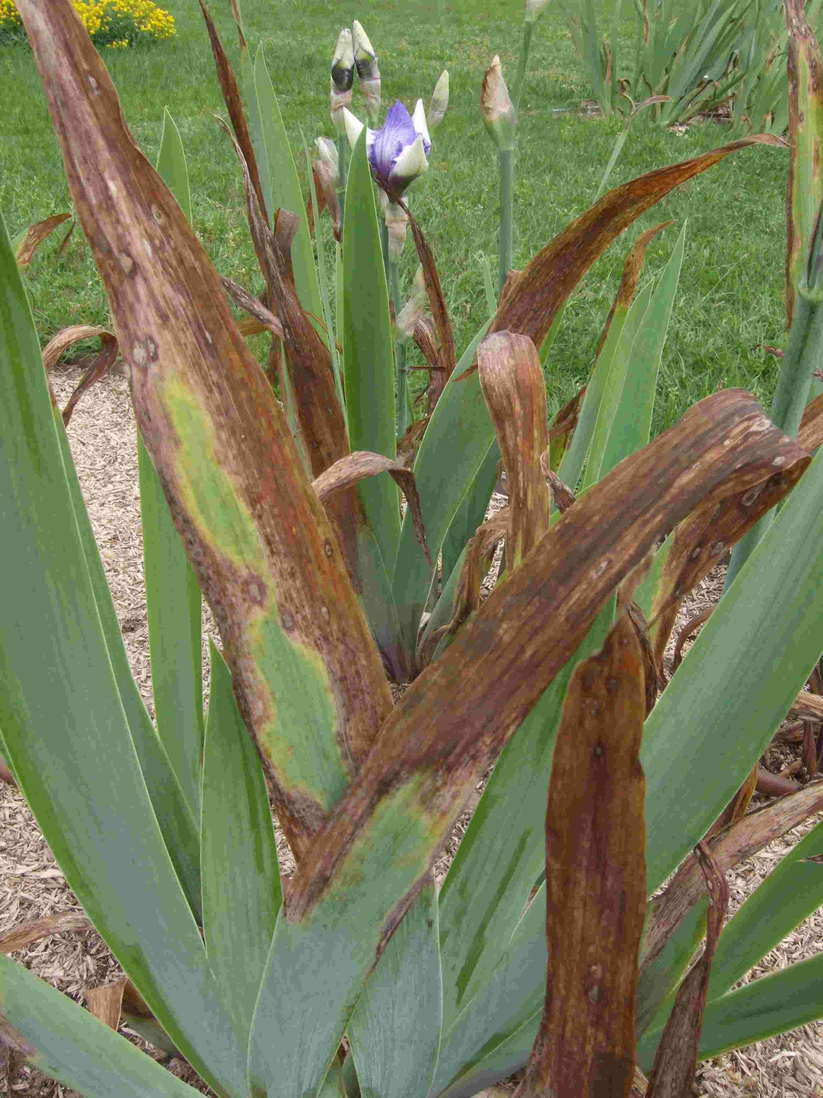 Les taches sont d’abord rondes puis ovales. Dans un premier temps d’aspect huileux, les taches sont ensuite marquées au centre de brun rouge, puis enfin bordées d’une zone claire (taches à œil). Elles apparaissent principalement sur la partie supérieure des feuilles, mais peuvent également toucher les hampes florales et les boutons. Les taches grandissent et s’accompagnent d’un dessèchement de la pointe puis de la feuille entière qui prend alors une coloration brun rouge. Le champignon n’attaque pas le rhizome ou les racines, mais après plusieurs attaques successives, cette maladie peut affaiblir la plante et diminuer la floraison.
