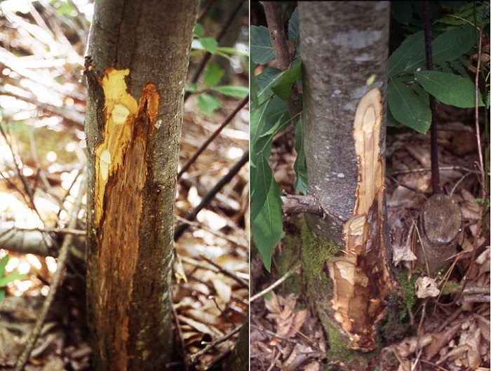 Lorsque l'agent pathogène a provoqué une altération importante des racines, cette altération se prolonge dans la base du tronc (le collet, Figures 2 et 3). Des écoulements noirs s'épanchent alors des craquelures de l'écorce qui recouvre les parties infectées du collet. Lorsque l'écorce est décapée, les tissus corticaux et le bois à nu sont colorés en brun, alors que sous l'écorce dans la zone non infectée ils sont de couleur blanc nacré (Figures 4 et 5). Ces tissus nécrosés sont les tissus envahis par l'agent pathogène.