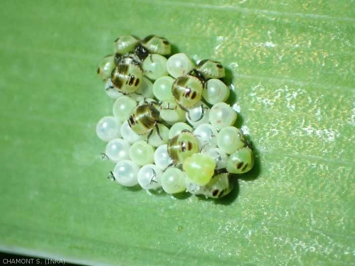 Insectes hétérométaboles, les punaises se développent en 5 stades larvaires avant la maturité sexuelle (figure 7) qui survient sans nymphose. Selon les espèces, les punaises hibernent à divers stades de leur croissance (oeuf, nymphe ou adulte). La forme des oeufs, leur emplacement et leur agencement sont généralement caractéristiques des différents genres. Ces oeufs sont pondus isolément ou groupés, ils peuvent être déposés à la surface des végétaux (figure 8) ou insérés à l'intérieur d'une tige ou sous l'écorce.