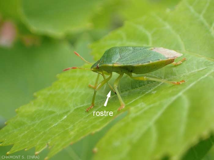 Insectes piqueurs suceurs, les punaises sont considérées en majorité comme nuisibles, du fait de leur mode d'alimentation. En effet, la salive injectée dans la plante avec leur rostre (figure 1), tue et dissout les cellules autour de la piqûre, le liquide obtenu étant ensuite aspiré. Lorsque l'insecte est présent en masse sur la plante, ou bien s'attaque aux tissus jeunes (bourgeons, feuilles en croissance) la multiplication des piqûres entraîne une nécrose rapide des tissus végétaux (figure 2). Les espèces pouvant faire des dégâts dans le vignoble ne sont pas spécifiques à la vigne, mais peuvent s'y développer lorsque la végétation adventice a été détruite, ou bien par la présence de plantes relais.