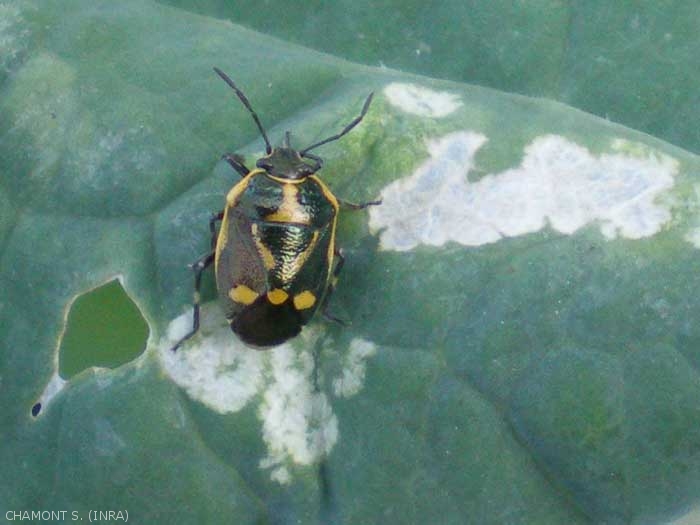 - Eurydema oleracea (Linnaeus 1758), punaise verte du chou ou punaise potagère, qui vit principalement sur les crucifères (figure 6), et qui peut se rencontrer dans le vignoble, là où ces plantes sont présentes (interrang). Elle peut s'attaquer aux jeunes feuilles de la vigne.