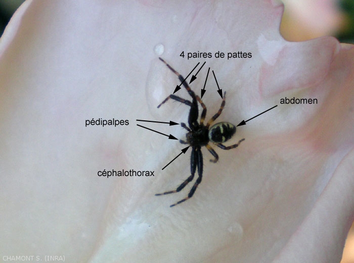 Les araignées appartiennent à l'ordre des aranéides (Aranae). Comme chez les acariens, le prosome est composé de la tête et du thorax soudés entre eux et portant les quatre paires de pattes composées de 7 articles. Jusqu'à 8 yeux simples sont insérés sur le prosome ainsi que des pédipalpes servant à la manipulation des proies (photos 1 et 2). Les araignées qui ne consomment que des proies vivantes, ne possèdent pas de pièces buccales broyeuses. Elles injectent par les chélicères (ou crochets), placés près de l'ouverture buccale, du venin pour immobiliser leur proie ainsi que des enzymes digestives qui vont liquéfier celle-ci et qu'elles vont ensuite aspirer.