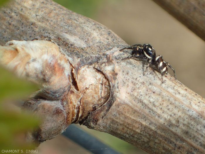 - Salticidae, ou araignées sauteuses. Famille assez facile à reconnaitre, ces araignées d'assez petite taille, sont des errantes dans la frondaison des vignes qui chassent à la vue et capturent leur proies en sautant dessus, elles ne construisent habituellement pas de toiles (photos 7 et 8). Ces araignées chassent au sol ou dans la végétation.