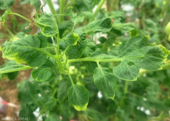 - Folioles et feuilles : mosaïque, jaunissement nervaire, chlorose, marbrure ; déformations foliaires diverses (figures 1 à 5),