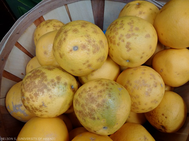 - Fruits : taches circulaires noires de plus de 5 mm de diamètre se forment à la surface de l'épiderme sous lesquelles la pulpe brunit et pourrit.