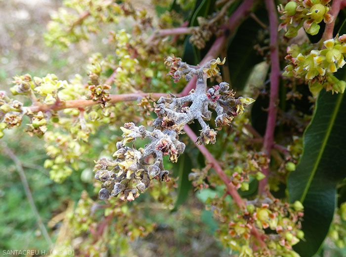 L'anthracnose causée par Colletotrichum gloeosporiodes : taches noires, en forme d'épingle, sur les fleurs et les panicules ; les fleurs mortes deviennent noir d'encre alors que pour l'oidium les panicules sont couvertes d'un voile gris blanchâtre ; les fleurs mortes deviennent marron et grises.